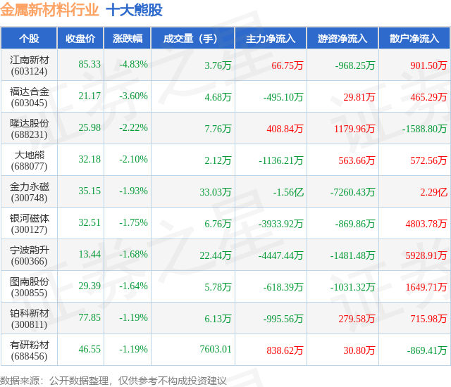 个股表现方面,金属新材料行业当日领跌股为江南新材(603124),该股当日报收85.33,下跌4.83%,成交量3.76万,主力资金净流入66.75万元。福达合金(603045)以下跌3.6%紧随其后,该股当日成交量4.68万,主力资金净流出495.1万元。除此之外,隆达股份(688231)、大地熊(688077)、金力永磁(300748)均进入当日熊股之列。具体个股列表见下表: