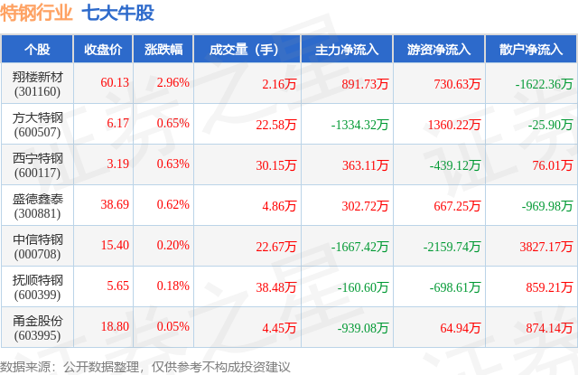 个股表现方面,特钢行业当日领涨股为翔楼新材(301160),该股当日报收60.13,上涨2.96%,成交量2.16万,主力资金净流入891.73万元。方大特钢(600507)以上涨0.65%紧随其后,该股当日成交量22.58万,主力资金净流出1334.32万元。除此之外,西宁特钢(600117)、盛德鑫泰(300881)、中信特钢(000708)均进入当日牛股之列。具体个股列表见下表: