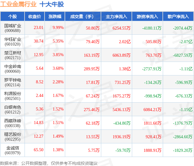 个股表现方面,工业金属行业当日领涨股为国城矿业(000688),该股当日报收23.01,上涨9.99%,成交量50.8万,主力资金净流入6254.55万元。华钰矿业(601020)以上涨5.35%紧随其后,该股当日成交量79.4万,主力资金净流入2.02亿元。除此之外,楚江新材(002171)、中金岭南(000060)、罗平锌电(002114)均进入当日牛股之列。具体个股列表见下表: