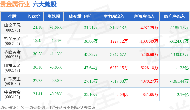 个股表现方面,贵金属行业当日领跌股为山金国际(000975),该股当日报收21.1,下跌1.86%,成交量31.71万,主力资金净流出3102.13万元。招金黄金(000506)以下跌1.43%紧随其后,该股当日成交量38.68万,主力资金净流入1227.12万元。除此之外,赤峰黄金(600988)、山东黄金(600547)、西部黄金(601069)均进入当日熊股之列。具体个股列表见下表: