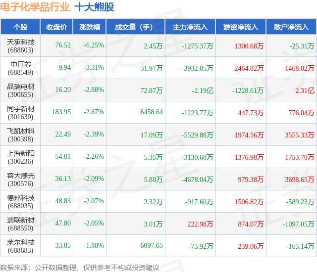 个股表现方面,电子化学品行业当日领跌股为天承科技(688603),该股当日报收76.52,下跌6.25%,成交量2.45万,主力资金净流出1275.37万元。中巨芯(688549)以下跌3.31%紧随其后,该股当日成交量31.97万,主力资金净流出3932.85万元。除此之外,晶瑞电材(300655)、同宇新材(301630)、飞凯材料(300398)均进入当日熊股之列。具体个股列表见下表: