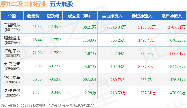 个股表现方面,摩托车及其他行业当日领跌股为千里科技(601777),该股当日报收11.53,下跌2.95%,成交量38.21万,主力资金净流出8816.34万元。隆鑫通用(603766)以下跌1.75%紧随其后,该股当日成交量17.43万,主力资金净流出855.26万元。除此之外,征和工业(003033)、九号公司(689009)、华洋赛车(920058)均进入当日熊股之列。具体个股列表见下表: