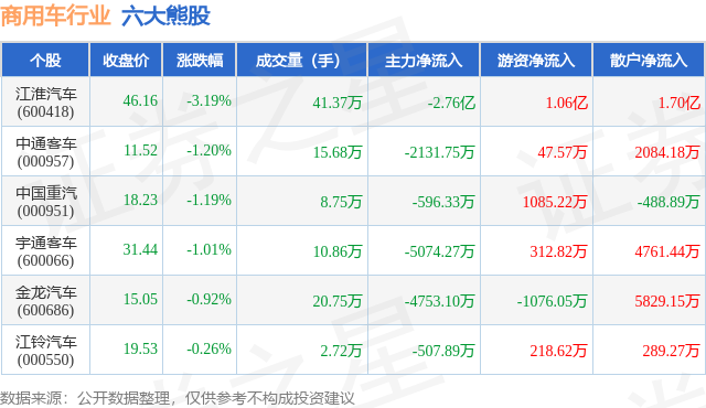 个股表现方面,商用车行业当日领跌股为江淮汽车(600418),该股当日报收46.16,下跌3.19%,成交量41.37万,主力资金净流出2.76亿元。中通客车(000957)以下跌1.2%紧随其后,该股当日成交量15.68万,主力资金净流出2131.75万元。除此之外,中国重汽(000951)、宇通客车(600066)、金龙汽车(600686)均进入当日熊股之列。具体个股列表见下表: