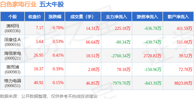 个股表现方面,白色家电行业当日领涨股为澳柯玛(600336),该股当日报收7.17,上涨0.7%,成交量14.31万,主力资金净流入225.18万元。深康佳A(000016)以上涨0.53%紧随其后,该股当日成交量66.64万,主力资金净流出80.34万元。除此之外,海信家电(000921)、惠而浦(600983)、格力电器(000651)均进入当日牛股之列。具体个股列表见下表: