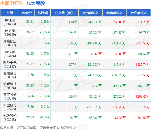 个股表现方面,小家电行业当日领跌股为倍轻松(688793),该股当日报收30.41,下跌2.28%,成交量1.01万,主力资金净流出453.38万元。倍益康(920199)以下跌1.85%紧随其后,该股当日成交量9563.0,主力资金净流出332.22万元。除此之外,开能健康(300272)、科沃斯(603486)、欧圣电气(301187)均进入当日熊股之列。具体个股列表见下表: