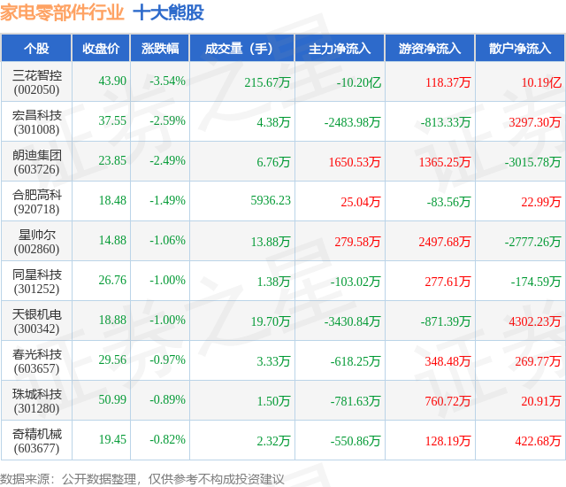 个股表现方面,家电零部件行业当日领跌股为三花智控(002050),该股当日报收43.9,下跌3.54%,成交量215.67万,主力资金净流出10.2亿元。宏昌科技(301008)以下跌2.59%紧随其后,该股当日成交量4.38万,主力资金净流出2483.98万元。除此之外,朗迪集团(603726)、合肥高科(920718)、星帅尔(002860)均进入当日熊股之列。具体个股列表见下表: