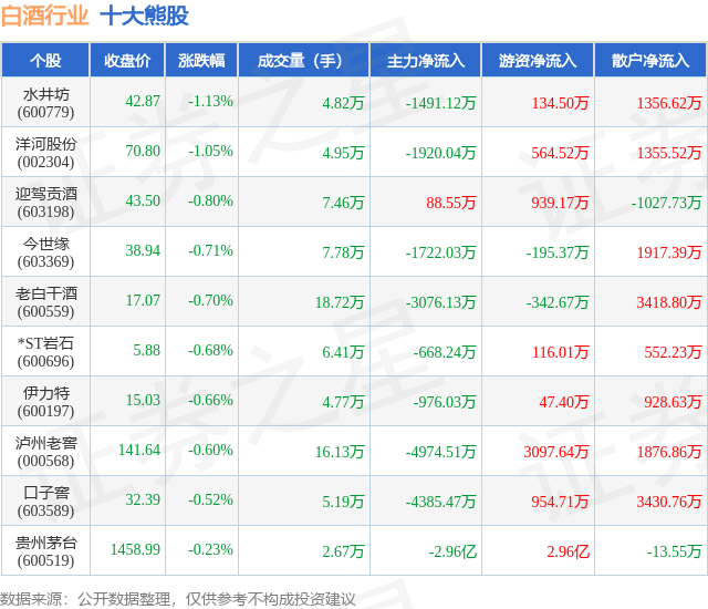 个股表现方面,白酒行业当日领跌股为水井坊(600779),该股当日报收42.87,下跌1.13%,成交量4.82万,主力资金净流出1491.12万元。洋河股份(002304)以下跌1.05%紧随其后,该股当日成交量4.95万,主力资金净流出1920.04万元。除此之外,迎驾贡酒(603198)、今世缘(603369)、老白干酒(600559)均进入当日熊股之列。具体个股列表见下表: