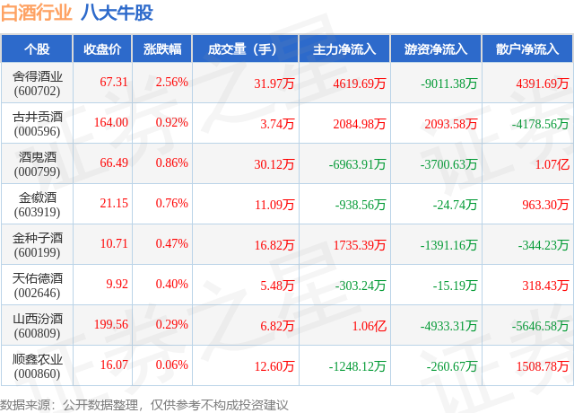 个股表现方面,白酒行业当日领涨股为舍得酒业(600702),该股当日报收67.31,上涨2.56%,成交量31.97万,主力资金净流入4619.69万元。古井贡酒(000596)以上涨0.92%紧随其后,该股当日成交量3.74万,主力资金净流入2084.98万元。除此之外,酒鬼酒(000799)、金徽酒(603919)、金种子酒(600199)均进入当日牛股之列。具体个股列表见下表: