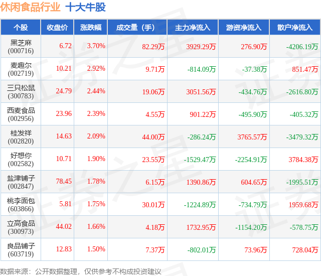 个股表现方面,休闲食品行业当日领涨股为黑芝麻(000716),该股当日报收6.72,上涨3.7%,成交量82.29万,主力资金净流入3929.29万元。麦趣尔(002719)以上涨2.92%紧随其后,该股当日成交量9.71万,主力资金净流出814.09万元。除此之外,三只松鼠(300783)、西麦食品(002956)、桂发祥(002820)均进入当日牛股之列。具体个股列表见下表: