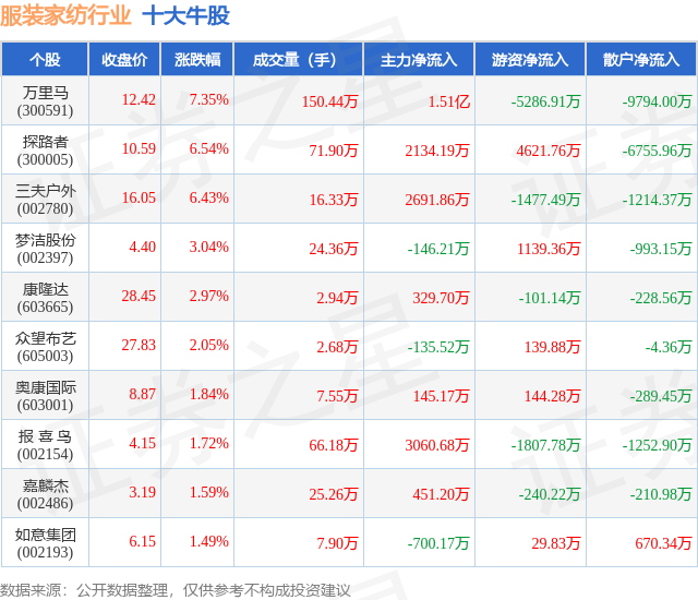 个股表现方面,服装家纺行业当日领涨股为万里马(300591),该股当日报收12.42,上涨7.35%,成交量150.44万,主力资金净流入1.51亿元。探路者(300005)以上涨6.54%紧随其后,该股当日成交量71.9万,主力资金净流入2134.19万元。除此之外,三夫户外(002780)、梦洁股份(002397)、康隆达(603665)均进入当日牛股之列。具体个股列表见下表: