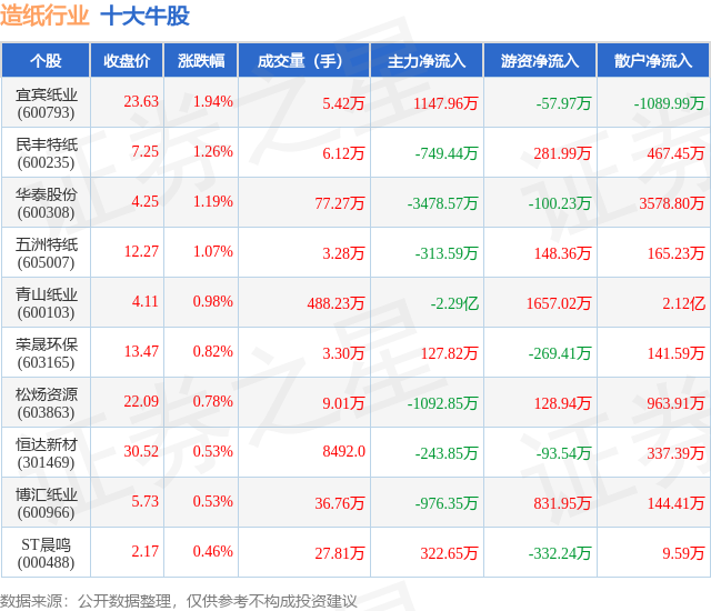 个股表现方面,造纸行业当日领涨股为宜宾纸业(600793),该股当日报收23.63,上涨1.94%,成交量5.42万,主力资金净流入1147.96万元。民丰特纸(600235)以上涨1.26%紧随其后,该股当日成交量6.12万,主力资金净流出749.44万元。除此之外,华泰股份(600308)、五洲特纸(605007)、青山纸业(600103)均进入当日牛股之列。具体个股列表见下表: