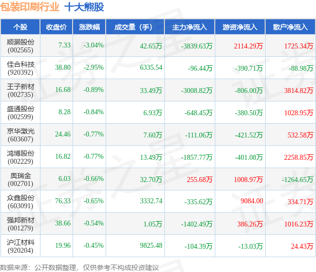 个股表现方面,包装印刷行业当日领跌股为顺灏股份(002565),该股当日报收7.33,下跌3.04%,成交量42.65万,主力资金净流出3839.63万元。佳合科技(920392)以下跌2.95%紧随其后,该股当日成交量6336.0,主力资金净流出96.44万元。除此之外,王子新材(002735)、盛通股份(002599)、京华激光(603607)均进入当日熊股之列。具体个股列表见下表: