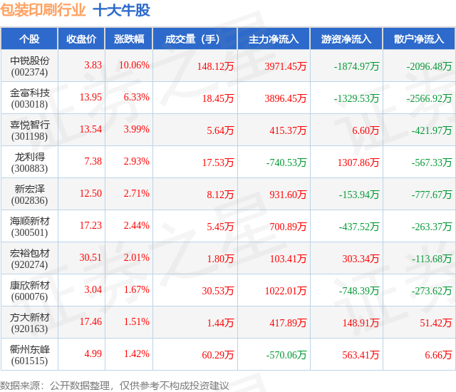 个股表现方面,包装印刷行业当日领涨股为中锐股份(002374),该股当日报收3.83,上涨10.06%,成交量148.12万,主力资金净流入3971.45万元。金富科技(003018)以上涨6.33%紧随其后,该股当日成交量18.45万,主力资金净流入3896.45万元。除此之外,喜悦智行(301198)、龙利得(300883)、新宏泽(002836)均进入当日牛股之列。具体个股列表见下表: