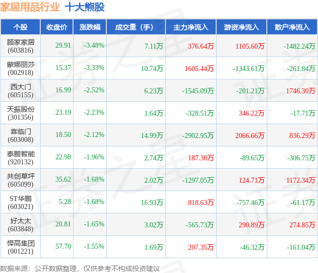 个股表现方面,家居用品行业当日领跌股为顾家家居(603816),该股当日报收29.91,下跌3.48%,成交量7.11万,主力资金净流入376.64万元。蒙娜丽莎(002918)以下跌3.33%紧随其后,该股当日成交量10.74万,主力资金净流入1605.44万元。除此之外,西大门(605155)、天振股份(301356)、喜临门(603008)均进入当日熊股之列。具体个股列表见下表:
