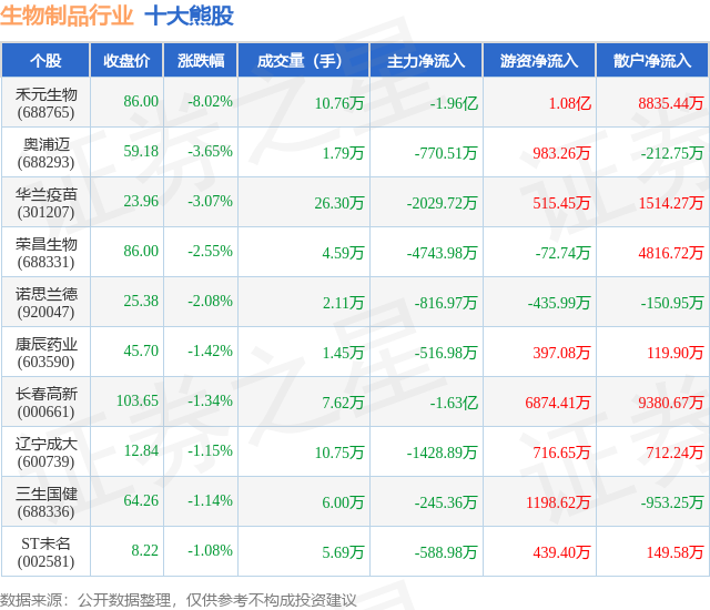 个股表现方面,生物制品行业当日领跌股为禾元生物(688765),该股当日报收86.0,下跌8.02%,成交量10.76万,主力资金净流出1.96亿元。奥浦迈(688293)以下跌3.65%紧随其后,该股当日成交量1.79万,主力资金净流出770.51万元。除此之外,华兰疫苗(301207)、荣昌生物(688331)、诺思兰德(920047)均进入当日熊股之列。具体个股列表见下表: