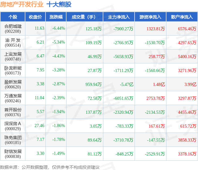 个股表现方面,房地产开发行业当日领跌股为合肥城建(002208),该股当日报收11.63,下跌6.44%,成交量125.18万,主力资金净流出7900.27万元。渝 开 发(000514)以下跌5.34%紧随其后,该股当日成交量109.19万,主力资金净流出2766.95万元。除此之外,上实发展(600748)、卧龙新能(600173)、盈新发展(000620)均进入当日熊股之列。具体个股列表见下表: