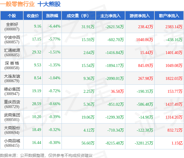 个股表现方面,一般零售行业当日领跌股为全新好(000007),该股当日报收9.16,下跌6.44%,成交量31.91万,主力资金净流出2621.56万元。宁波中百(600857)以下跌5.77%紧随其后,该股当日成交量15.59万,主力资金净流出602.7万元。除此之外,汇通能源(600605)、深 赛 格(000058)、大连友谊(000679)均进入当日熊股之列。具体个股列表见下表: