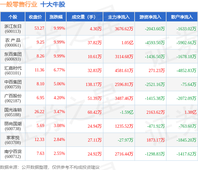 个股表现方面,一般零售行业当日领涨股为浙江东日(600113),该股当日报收53.27,上涨9.99%,成交量4.3万,主力资金净流入3676.62万元。农 产 品(000061)以上涨9.99%紧随其后,该股当日成交量37.82万,主力资金净流入1.05亿元。除此之外,东百集团(600693)、汇嘉时代(603101)、中百集团(000759)均进入当日牛股之列。具体个股列表见下表:
