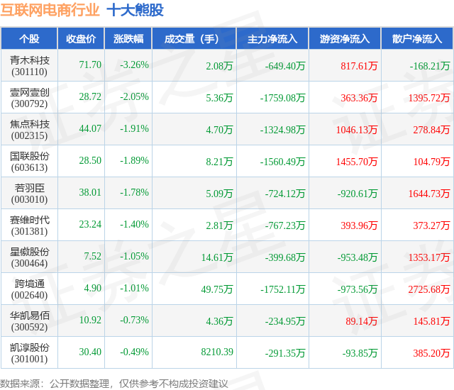个股表现方面,互联网电商行业当日领跌股为青木科技(301110),该股当日报收71.7,下跌3.26%,成交量2.08万,主力资金净流出649.4万元。壹网壹创(300792)以下跌2.05%紧随其后,该股当日成交量5.36万,主力资金净流出1759.08万元。除此之外,焦点科技(002315)、国联股份(603613)、若羽臣(003010)均进入当日熊股之列。具体个股列表见下表: