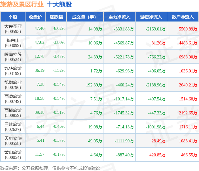 个股表现方面,旅游及景区行业当日领跌股为大连圣亚(600593),该股当日报收47.4,下跌6.62%,成交量14.08万,主力资金净流出3331.88万元。长白山(603099)以下跌3.8%紧随其后,该股当日成交量10.06万,主力资金净流出4569.87万元。除此之外,岭南控股(000524)、九华旅游(603199)、凯撒旅业(000796)均进入当日熊股之列。具体个股列表见下表: