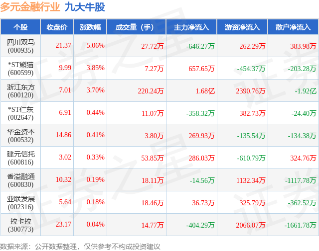 个股表现方面,多元金融行业当日领涨股为四川双马(000935),该股当日报收21.37,上涨5.06%,成交量27.72万,主力资金净流出646.27万元。*ST熊猫(600599)以上涨3.85%紧随其后,该股当日成交量7.27万,主力资金净流入657.65万元。除此之外,浙江东方(600120)、*ST仁东(002647)、华金资本(000532)均进入当日牛股之列。具体个股列表见下表: