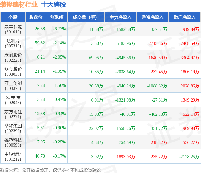 个股表现方面,装修建材行业当日领跌股为晶雪节能(301010),该股当日报收26.58,下跌6.77%,成交量11.58万,主力资金净流出1582.38万元。法狮龙(605318)以下跌2.14%紧随其后,该股当日成交量3.5万,主力资金净流出5183.96万元。除此之外,濮耐股份(002225)、华立股份(603038)、亚士创能(603378)均进入当日熊股之列。具体个股列表见下表: