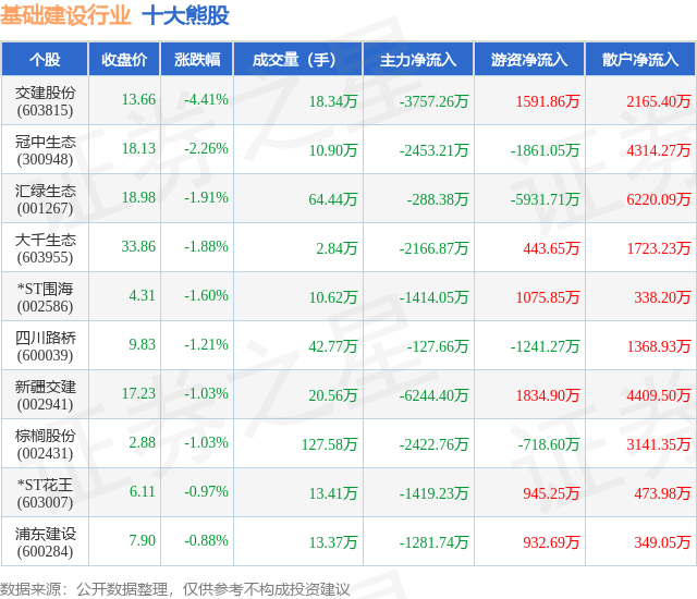 个股表现方面,基础建设行业当日领跌股为交建股份(603815),该股当日报收13.66,下跌4.41%,成交量18.34万,主力资金净流出3757.26万元。冠中生态(300948)以下跌2.26%紧随其后,该股当日成交量10.9万,主力资金净流出2453.21万元。除此之外,汇绿生态(001267)、大千生态(603955)、*ST围海(002586)均进入当日熊股之列。具体个股列表见下表: