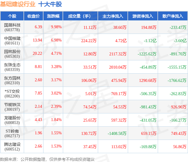 个股表现方面,基础建设行业当日领涨股为国晟科技(603778),该股当日报收6.39,上涨9.98%,成交量11.12万,主力资金净流入38.6万元。中国核建(601611)以上涨6.98%紧随其后,该股当日成交量224.22万,主力资金净流入4.72亿元。除此之外,园林股份(605303)、东珠生态(603359)、东方园林(002310)均进入当日牛股之列。具体个股列表见下表: