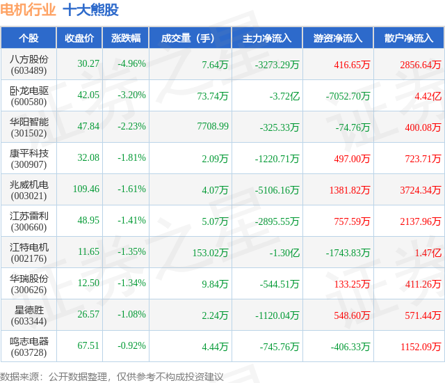个股表现方面,电机行业当日领跌股为八方股份(603489),该股当日报收30.27,下跌4.96%,成交量7.64万,主力资金净流出3273.29万元。卧龙电驱(600580)以下跌3.2%紧随其后,该股当日成交量73.74万,主力资金净流出3.72亿元。除此之外,华阳智能(301502)、康平科技(300907)、兆威机电(003021)均进入当日熊股之列。具体个股列表见下表: