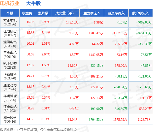 个股表现方面,电机行业当日领涨股为方正电机(002196),该股当日报收15.98,上涨9.98%,成交量175.13万,主力资金净流入1.98亿元。佳电股份(000922)以上涨5.14%紧随其后,该股当日成交量59.43万,主力资金净流入1283.47万元。除此之外,迪贝电气(603320)、三协电机(920100)、凯中精密(002823)均进入当日牛股之列。具体个股列表见下表: