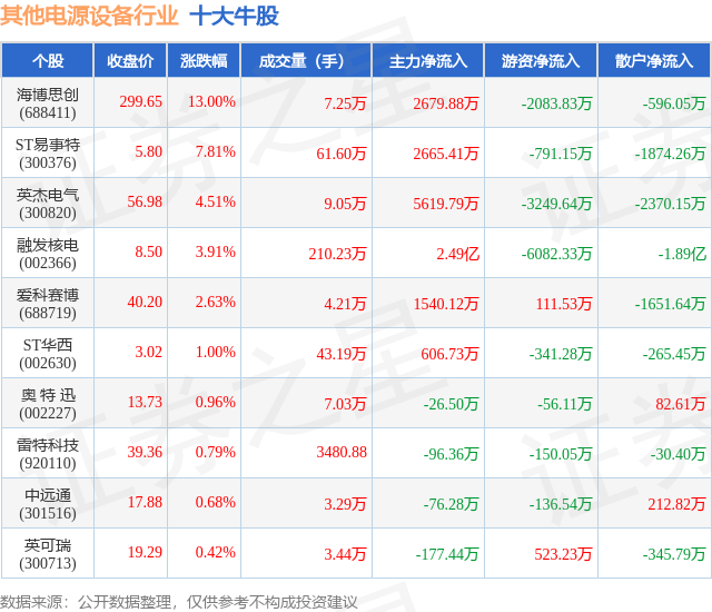 个股表现方面,其他电源设备行业当日领涨股为海博思创(688411),该股当日报收299.65,上涨13.0%,成交量7.25万,主力资金净流入2679.88万元。ST易事特(300376)以上涨7.81%紧随其后,该股当日成交量61.6万,主力资金净流入2665.41万元。除此之外,英杰电气(300820)、融发核电(002366)、爱科赛博(688719)均进入当日牛股之列。具体个股列表见下表: