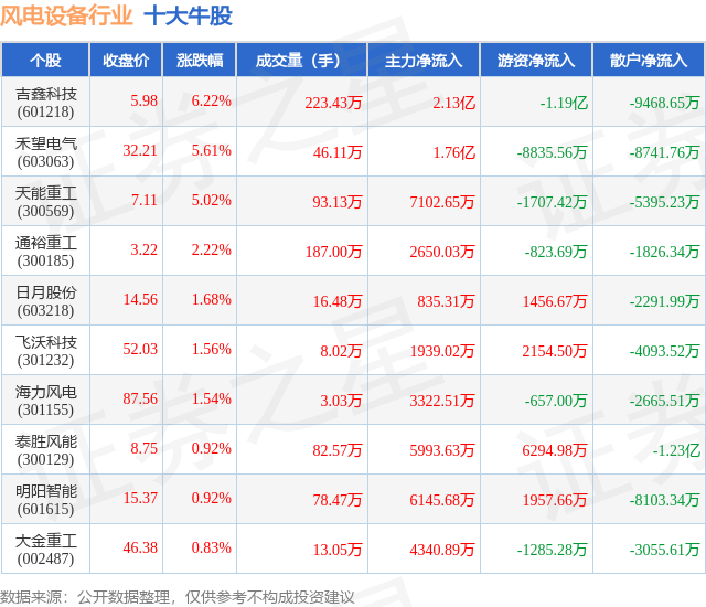 个股表现方面,风电设备行业当日领涨股为吉鑫科技(601218),该股当日报收5.98,上涨6.22%,成交量223.43万,主力资金净流入2.13亿元。禾望电气(603063)以上涨5.61%紧随其后,该股当日成交量46.11万,主力资金净流入1.76亿元。除此之外,天能重工(300569)、通裕重工(300185)、日月股份(603218)均进入当日牛股之列。具体个股列表见下表: