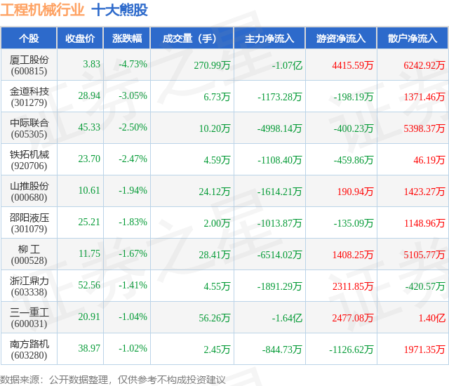 个股表现方面,工程机械行业当日领跌股为厦工股份(600815),该股当日报收3.83,下跌4.73%,成交量270.99万,主力资金净流出1.07亿元。金道科技(301279)以下跌3.05%紧随其后,该股当日成交量6.73万,主力资金净流出1173.28万元。除此之外,中际联合(605305)、铁拓机械(920706)、山推股份(000680)均进入当日熊股之列。具体个股列表见下表: