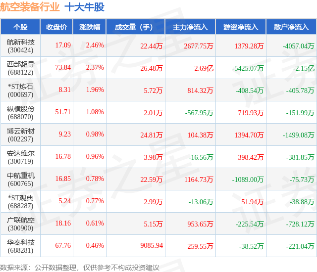 个股表现方面,航空装备行业当日领涨股为航新科技(300424),该股当日报收17.09,上涨2.46%,成交量22.44万,主力资金净流入2677.75万元。西部超导(688122)以上涨2.37%紧随其后,该股当日成交量26.48万,主力资金净流入2.69亿元。除此之外,*ST炼石(000697)、纵横股份(688070)、博云新材(002297)均进入当日牛股之列。具体个股列表见下表: