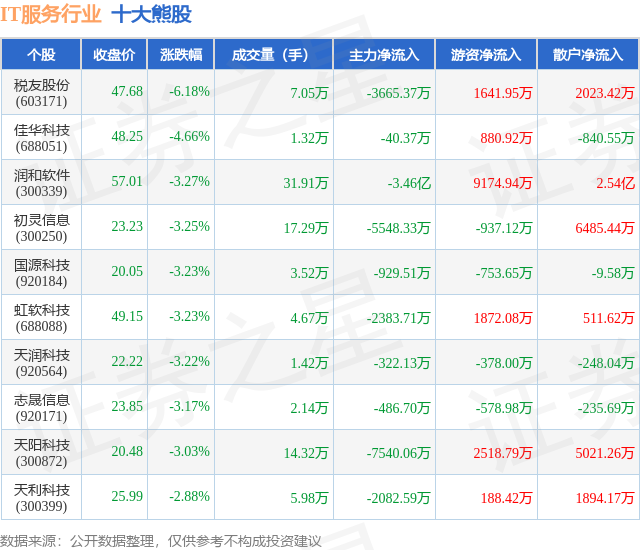 个股表现方面,IT服务行业当日领跌股为税友股份(603171),该股当日报收47.68,下跌6.18%,成交量7.05万,主力资金净流出3665.37万元。佳华科技(688051)以下跌4.66%紧随其后,该股当日成交量1.32万,主力资金净流出40.37万元。除此之外,润和软件(300339)、初灵信息(300250)、国源科技(920184)均进入当日熊股之列。具体个股列表见下表: