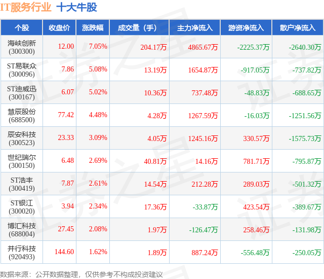 个股表现方面,IT服务行业当日领涨股为海峡创新(300300),该股当日报收12.0,上涨7.05%,成交量204.17万,主力资金净流入4865.67万元。ST易联众(300096)以上涨5.08%紧随其后,该股当日成交量13.19万,主力资金净流入1654.87万元。除此之外,ST迪威迅(300167)、慧辰股份(688500)、辰安科技(300523)均进入当日牛股之列。具体个股列表见下表:
