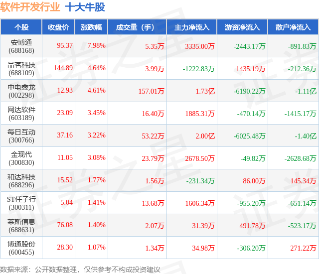 个股表现方面,软件开发行业当日领涨股为安博通(688168),该股当日报收95.37,上涨7.98%,成交量5.35万,主力资金净流入3335.0万元。品茗科技(688109)以上涨4.64%紧随其后,该股当日成交量3.99万,主力资金净流出1222.83万元。除此之外,中电鑫龙(002298)、网达软件(603189)、每日互动(300766)均进入当日牛股之列。具体个股列表见下表: