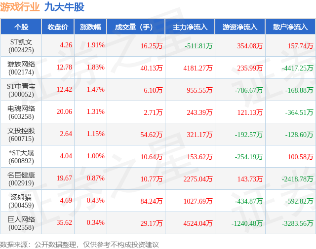 个股表现方面,游戏行业当日领涨股为ST凯文(002425),该股当日报收4.26,上涨1.91%,成交量16.25万,主力资金净流出511.81万元。游族网络(002174)以上涨1.83%紧随其后,该股当日成交量40.13万,主力资金净流入4181.27万元。除此之外,ST中青宝(300052)、电魂网络(603258)、文投控股(600715)均进入当日牛股之列。具体个股列表见下表: