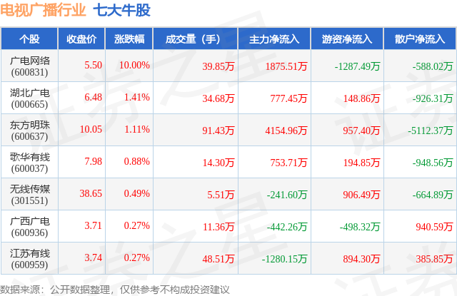 个股表现方面,电视广播行业当日领涨股为广电网络(600831),该股当日报收5.5,上涨10.0%,成交量39.85万,主力资金净流入1875.51万元。湖北广电(000665)以上涨1.41%紧随其后,该股当日成交量34.68万,主力资金净流入777.45万元。除此之外,东方明珠(600637)、歌华有线(600037)、无线传媒(301551)均进入当日牛股之列。具体个股列表见下表: