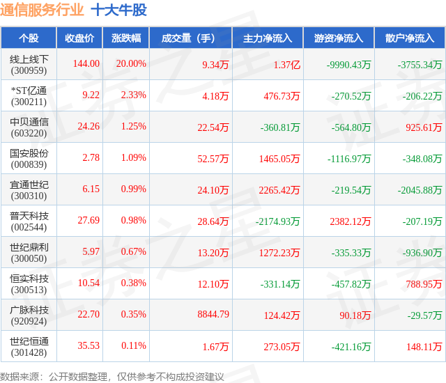 个股表现方面,通信服务行业当日领涨股为线上线下(300959),该股当日报收144.0,上涨20.0%,成交量9.34万,主力资金净流入1.37亿元。*ST亿通(300211)以上涨2.33%紧随其后,该股当日成交量4.18万,主力资金净流入476.73万元。除此之外,中贝通信(603220)、国安股份(000839)、宜通世纪(300310)均进入当日牛股之列。具体个股列表见下表: