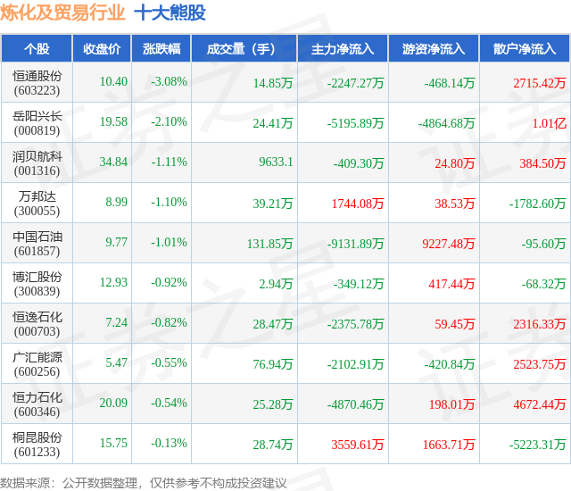 个股表现方面,炼化及贸易行业当日领跌股为恒通股份(603223),该股当日报收10.4,下跌3.08%,成交量14.85万,主力资金净流出2247.27万元。岳阳兴长(000819)以下跌2.1%紧随其后,该股当日成交量24.41万,主力资金净流出5195.89万元。除此之外,润贝航科(001316)、万邦达(300055)、中国石油(601857)均进入当日熊股之列。具体个股列表见下表:
