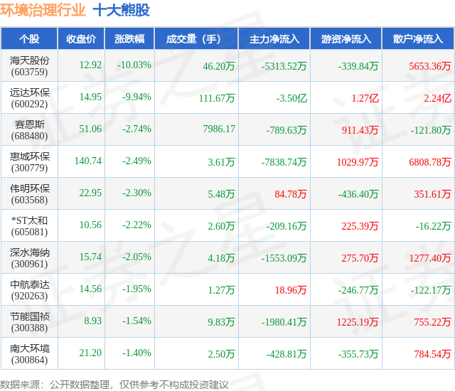 个股表现方面,环境治理行业当日领跌股为海天股份(603759),该股当日报收12.92,下跌10.03%,成交量46.2万,主力资金净流出5313.52万元。远达环保(600292)以下跌9.94%紧随其后,该股当日成交量111.67万,主力资金净流出3.5亿元。除此之外,赛恩斯(688480)、惠城环保(300779)、伟明环保(603568)均进入当日熊股之列。具体个股列表见下表: