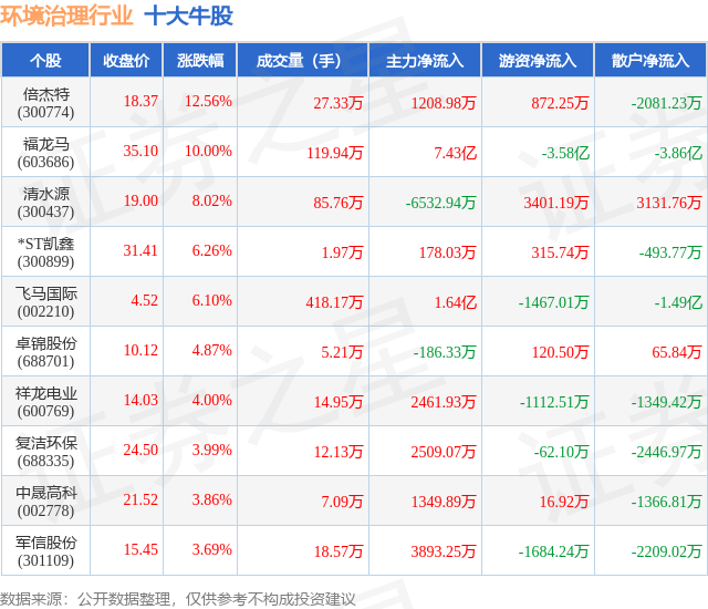 个股表现方面,环境治理行业当日领涨股为倍杰特(300774),该股当日报收18.37,上涨12.56%,成交量27.33万,主力资金净流入1208.98万元。福龙马(603686)以上涨10.0%紧随其后,该股当日成交量119.94万,主力资金净流入7.43亿元。除此之外,清水源(300437)、*ST凯鑫(300899)、飞马国际(002210)均进入当日牛股之列。具体个股列表见下表: