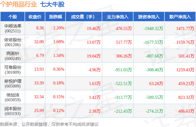 个股表现方面,个护用品行业当日领涨股为中顺洁柔(002511),该股当日报收8.36,上涨2.2%,成交量19.46万,主力资金净流入476.55万元。依依股份(001206)以上涨1.68%紧随其后,该股当日成交量13.07万,主力资金净流入517.77万元。除此之外,两面针(600249)、可靠股份(301009)、豪悦护理(605009)均进入当日牛股之列。具体个股列表见下表: