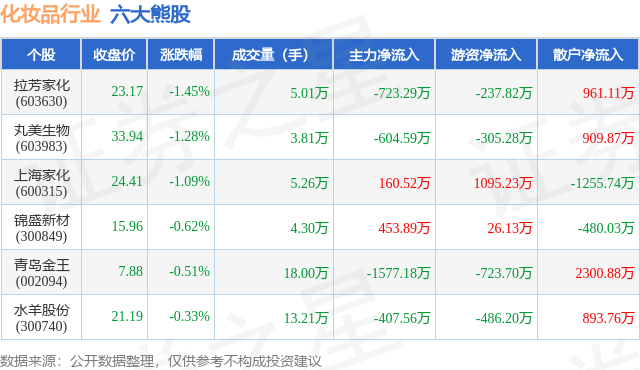 个股表现方面,化妆品行业当日领跌股为拉芳家化(603630),该股当日报收23.17,下跌1.45%,成交量5.01万,主力资金净流出723.29万元。丸美生物(603983)以下跌1.28%紧随其后,该股当日成交量3.81万,主力资金净流出604.59万元。除此之外,上海家化(600315)、锦盛新材(300849)、青岛金王(002094)均进入当日熊股之列。具体个股列表见下表: