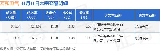 证券之星消息,11月11日万和电气发生大宗交易,交易数据如下: