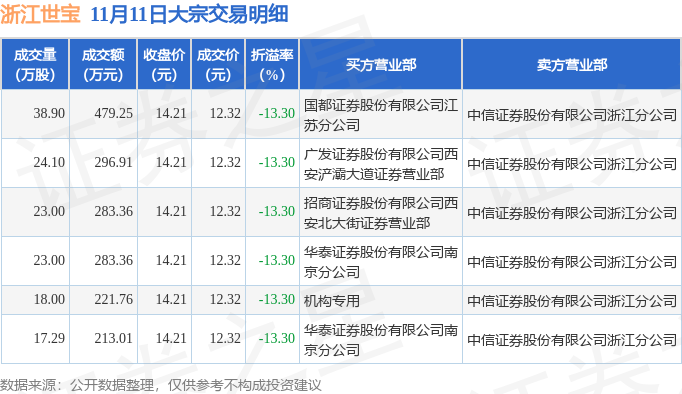 证券之星消息,11月11日浙江世宝发生大宗交易,交易数据如下: