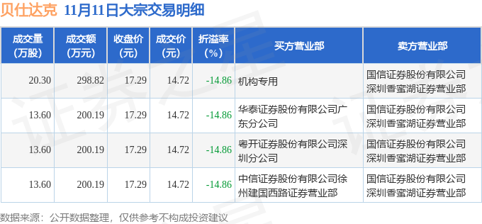 证券之星消息,11月11日贝仕达克发生大宗交易,交易数据如下: