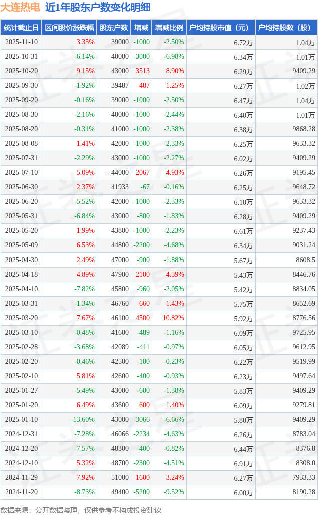 从股价来看,2025年10月31日至2025年11月10日,大连热电区间涨幅为3.35%,在此期间股东户数减少1000.0户,减幅为2.5%。