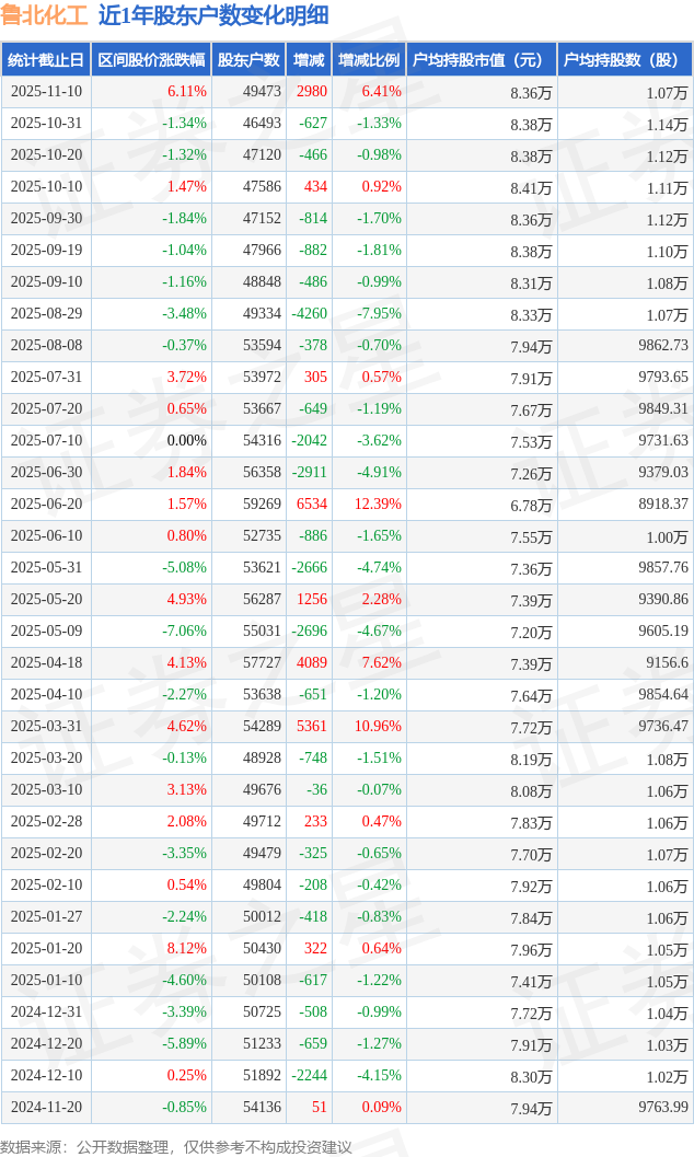 从股价来看,2025年10月31日至2025年11月10日,鲁北化工区间涨幅为6.11%,在此期间股东户数增加2980.0户,增幅为6.41%。